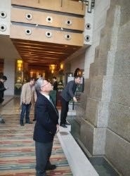 左:宴会ホール窓ガラス施工現場確認 右:17号棟玄関ホール施工現場確認(上から水が落下する噴水)