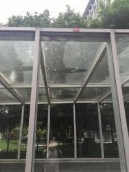 左:天井ガラス(ガラス左側は塗布済) 右:地下駐車場通路ガラス
